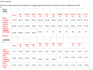 Please note we are now introducing a supplementary BAF surcharge. In the past, we have absorbed BAF surcharges applied by the ferry companies (both direct ferries and UK landbridge routes). Unfortunately, the increases in March 2022 are astronomical and we are now introducing a supplementary BAF surcharge to recover these extra ferry charges.
